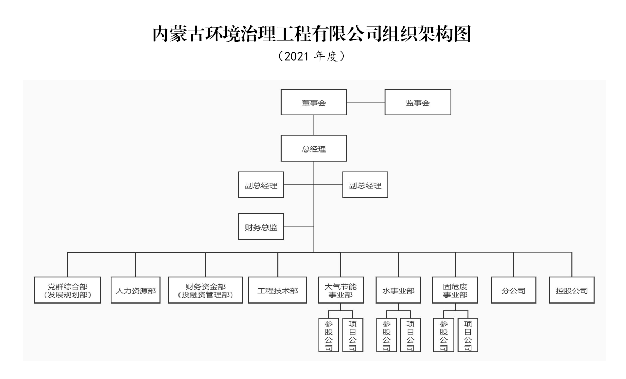 環(huán)境治理工程公司成立于2018年1月,注冊(cè)資本金1億元,是內(nèi)蒙古環(huán)保投資集團(tuán)有限公司(簡(jiǎn)稱“內(nèi)蒙古環(huán)投集團(tuán)”)旗下的全資子公司。截止2020年12月,擁有資產(chǎn)總額23278萬元;公司設(shè)有4個(gè)職能部門、3個(gè)事業(yè)部和11家控參股公司;各類專業(yè)技術(shù)人員56人。